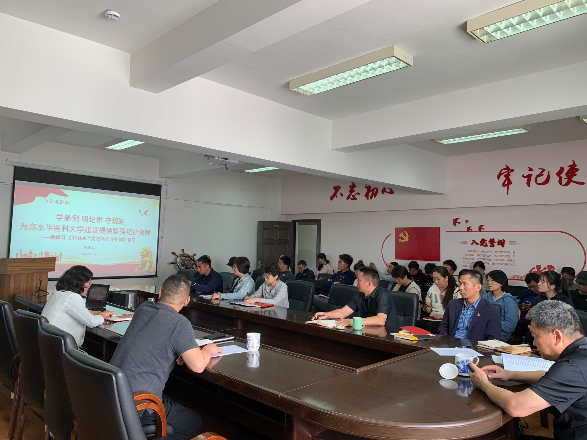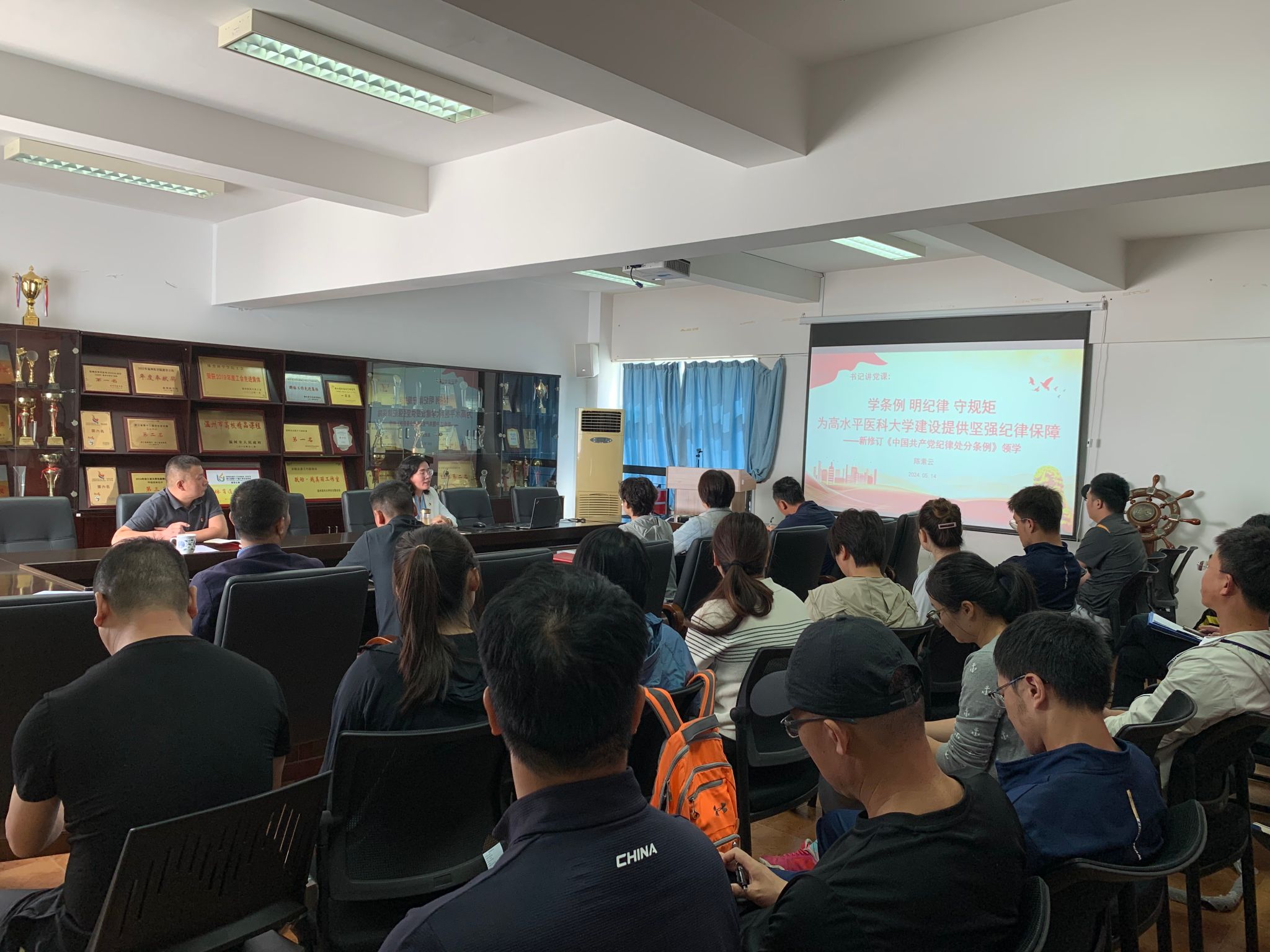 陈素云聚焦新修订的《中国共产党纪律处分条例》的制订及修订历程、重要意义、主要内容和变化,从三个方面入手,逐章逐条进行了解读,并结合工作实际,重点强调了与党员教师紧密相关的党纪条例。陈素云指出,在全党开展党纪学习教育,是以习近平同志为核心的党中央为加强党的纪律建设、推动全面从严治党的重要举措,党员教师要原原本本学,通过逐字逐句、逐章逐条、新旧对照等方式,学习吃透《条例》的精神实质和规定要求,掌握“六项纪律”的基本内涵和具体规定。党员教师要以党纪学习教育为契机,用党规党纪校正思想和行动,争当最讲党性、最讲政治、最讲忠诚、最讲担当的排头兵,为学校“双一流”创建和学部高质量发展提供坚强的纪律保障。