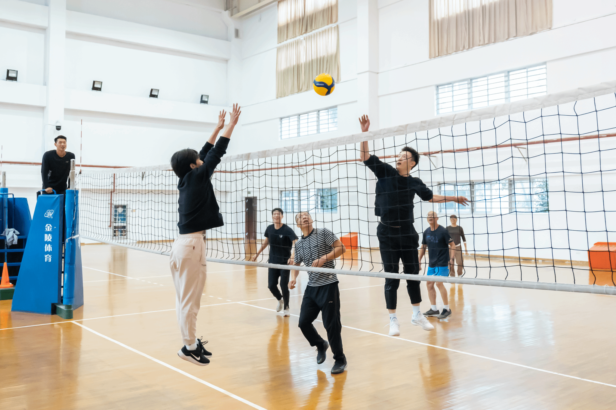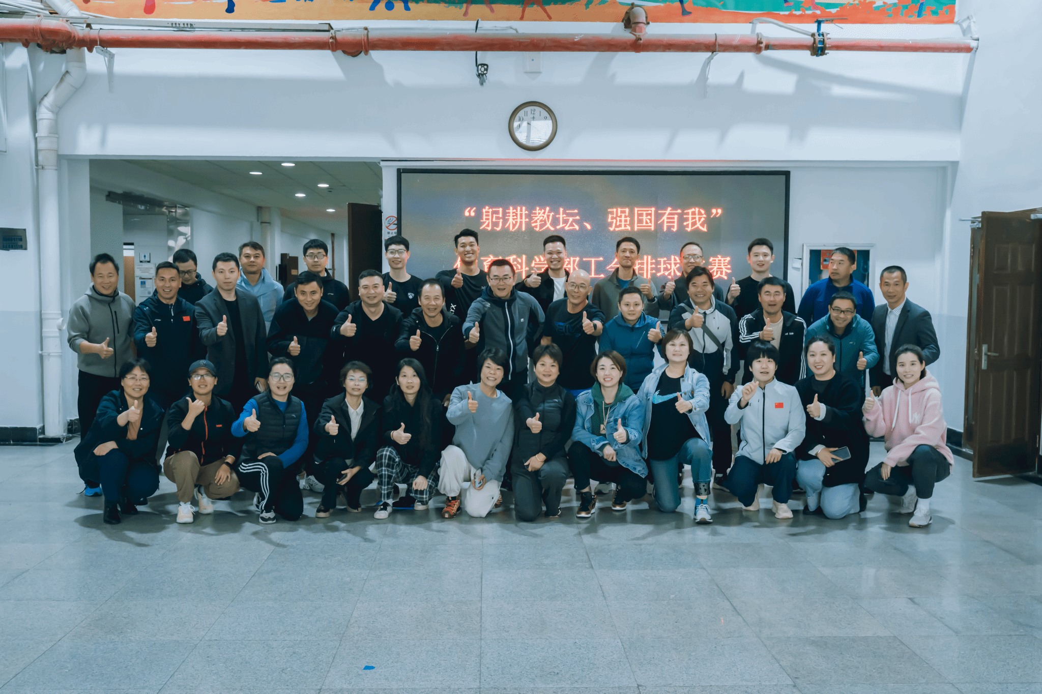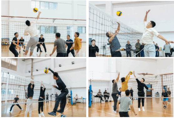 为迎接即将到来的学校运动会,增强体育科学部教职工的凝聚力,弘扬团队精神,学部于11月21日上午在校体育馆排球馆举办了以“躬耕教坛 强国有我”为主题的教职工排球友谊赛。本次比赛吸引了学部全体教职工的踊跃参与,比赛分两支队伍,双方通过激烈的比拼展现了团结协作的风采,活动氛围热烈而温馨。