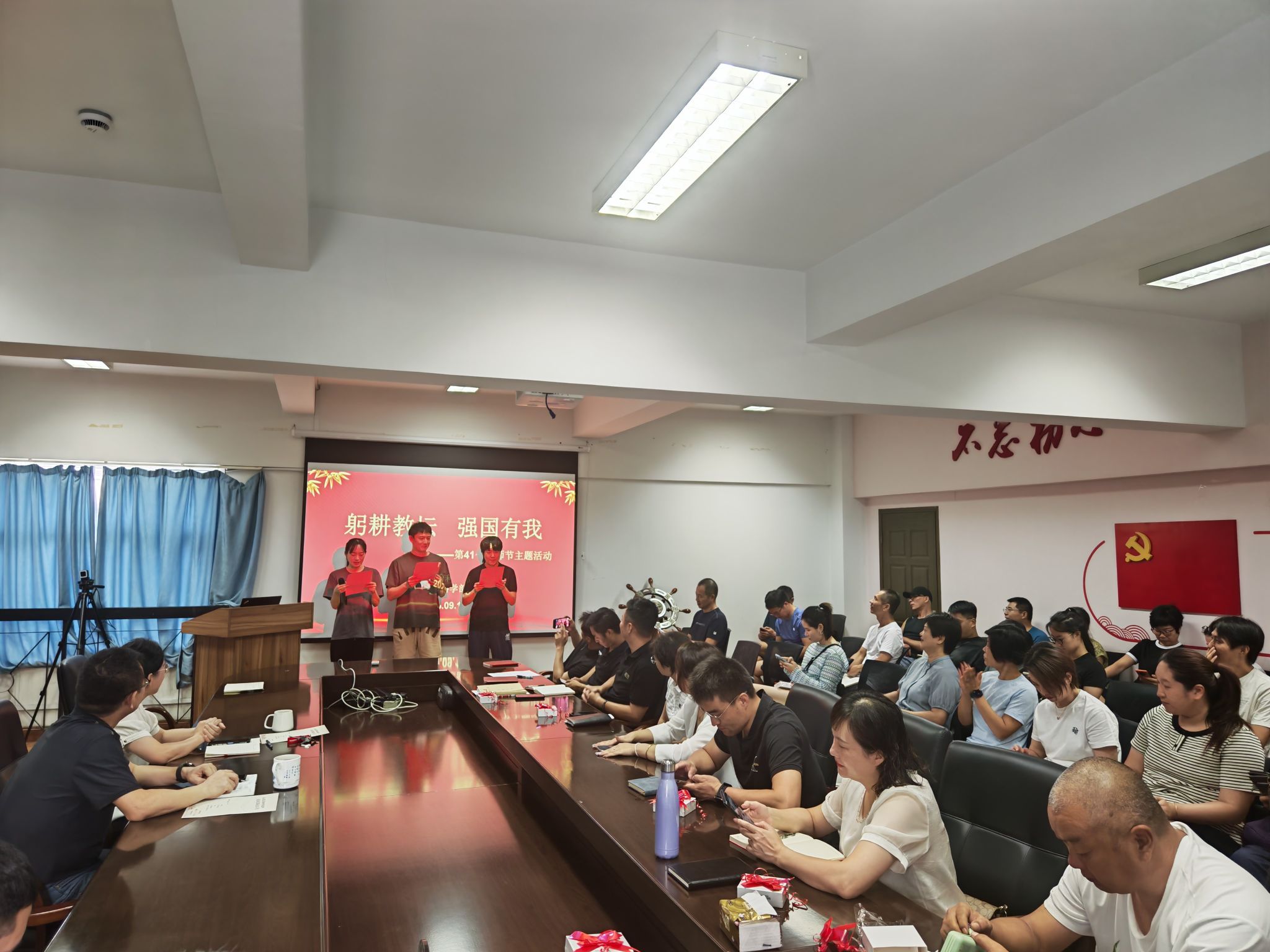 当天,a片漫画 在体育馆402会议室举办“躬耕教坛 强国有我”教师节主题活动。全体教职工齐聚一堂,共同庆祝属于自己的节日。王在韬、张千轶、林汝涵三位年轻教师朗诵《谢谢您,老师!》,铿锵有力的声音、真挚饱满的情感,生动表达了青年教师对教育事业的热爱。
