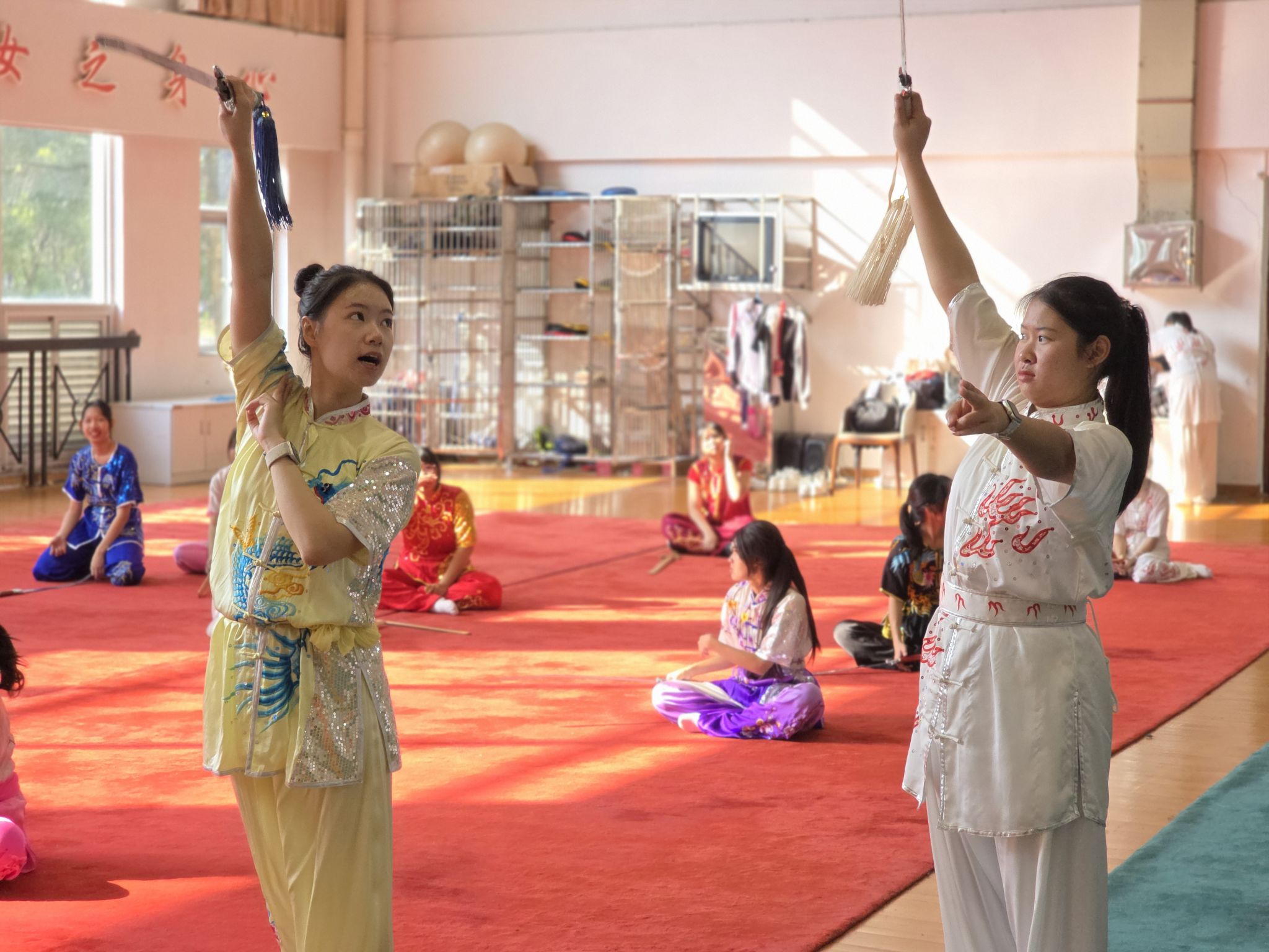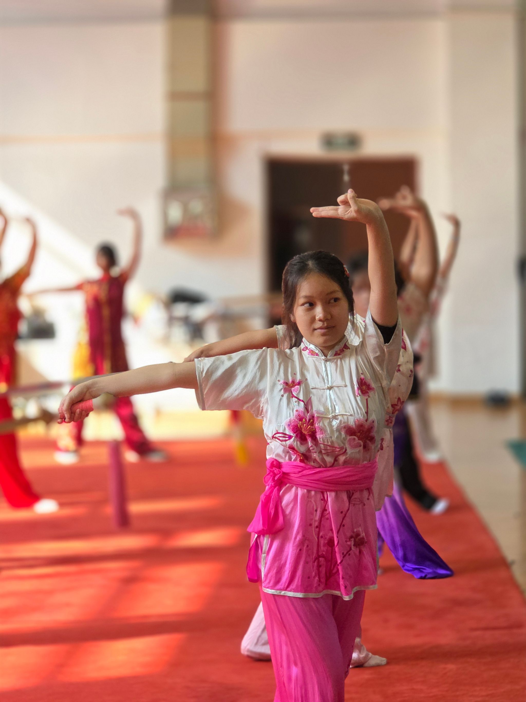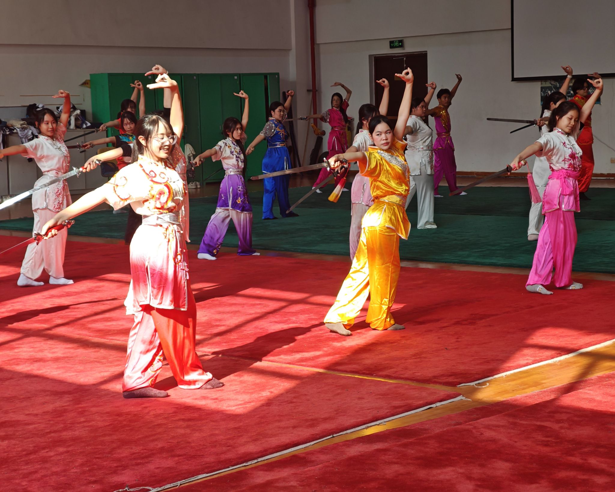 课堂上,陈捷思老师结合泰国师生的特点,设计了难易相当的教学内容。泰国师生身着传统武术服装,精神抖擞地跟随教师学习武术起势、抱拳礼等基础动作,他们在一招一式中体会“刚柔并济”的武术精髓。在舞剑教学环节,陈捷思老师耐心拆解动作要领,从握剑姿势到挥剑节奏逐一指导,学子们凝神聚力,认真模仿,尽显专注与热情。整个课堂氛围轻松热烈,充满欢声笑语。