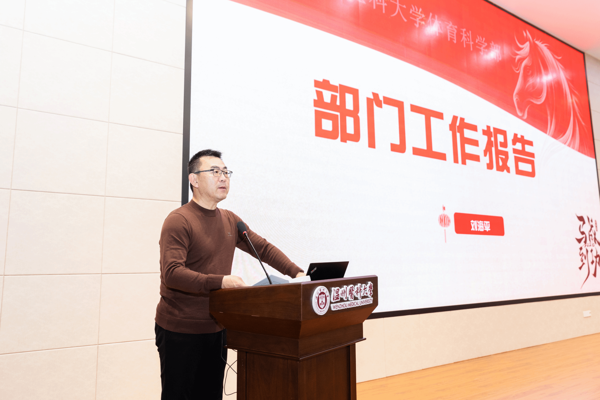 会议在庄严的国歌声中拉开序幕。首先由刘海平作《凝心聚力启新程 砥砺奋进开新局——奋力谱写学校体育事业高质量发展新篇章》的部门工作报告。报告从以下七个方面对2025年学部工作进行了全面回顾:一是党建引领强根基,全面从严治党纵深推进;二是教学改革深推进,体育育人功能全面发挥;三是科研师资双提升,核心竞争力不断增强;四是竞技体育创佳绩,运动竞技水平再攀高峰;五是群体活动显特色,校园文化繁荣发展;六是内涵建设提质效,管理服务水平优化;七是对外合作扩影响,服务地方能力增强。