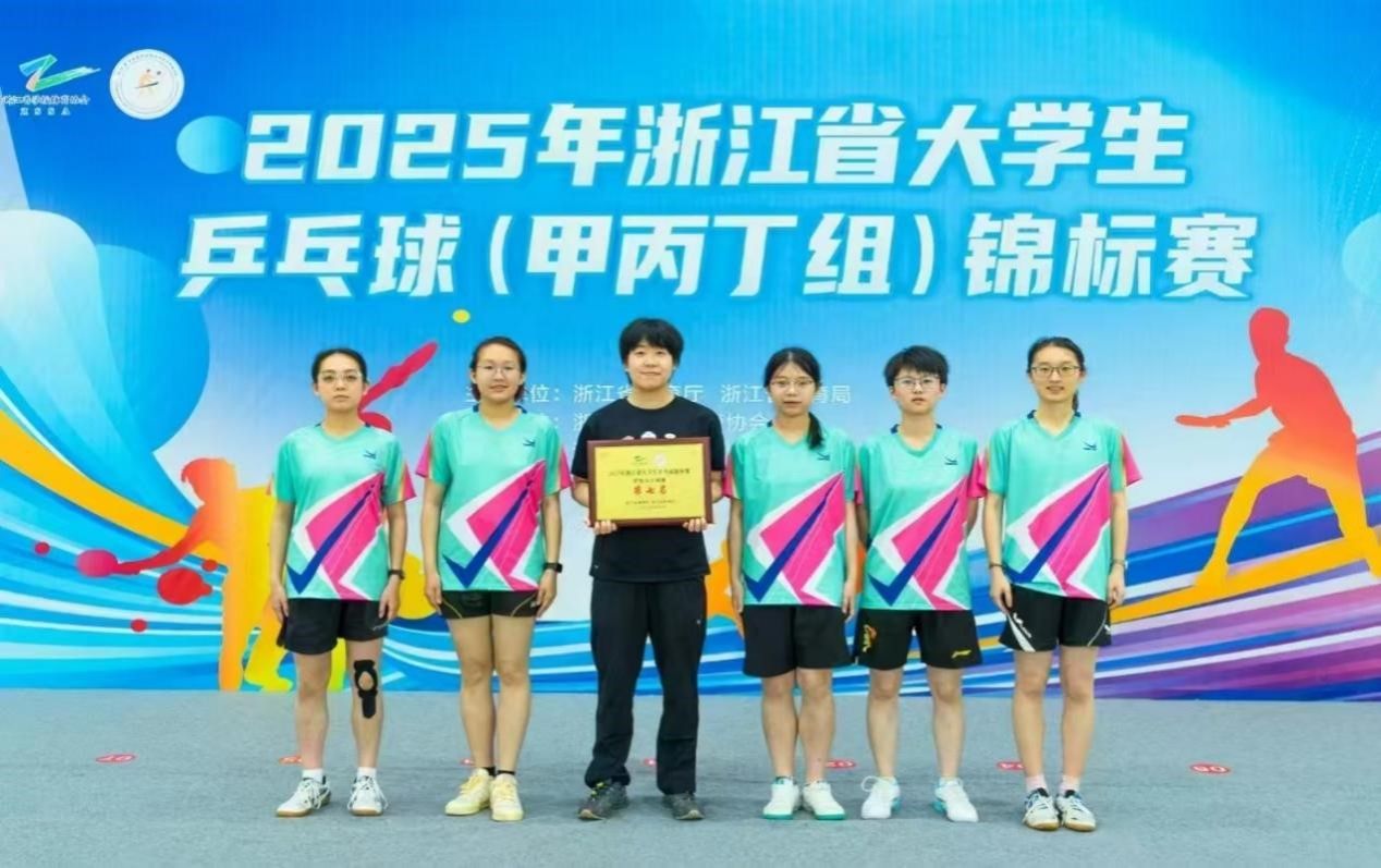 2025年5月,在仙居全民体育中心举行的浙江省大学生乒乓球(甲丙丁组)锦标赛中,我校乒乓球队队员团结一致、奋勇争先,在领队刘海平主任和教练张千轶的带领下,取得女子团体第七名、男子单打第六名的好成绩。此次比赛展示了我校学子扎实的技术功底和顽强拼搏的体育精神。
