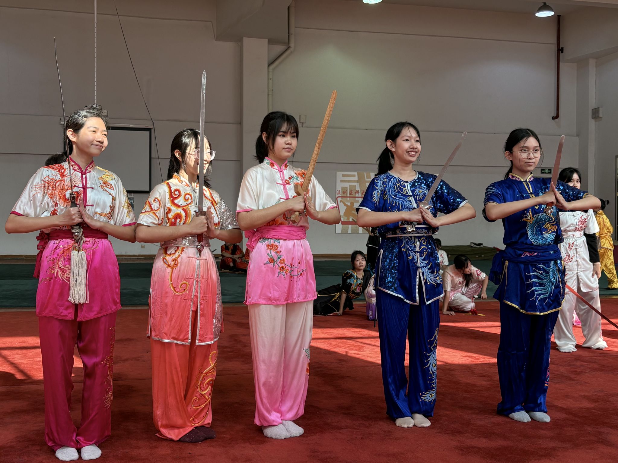 课堂上,陈捷思老师结合泰国师生的特点,设计了难易相当的教学内容。泰国师生身着传统武术服装,精神抖擞地跟随教师学习武术起势、抱拳礼等基础动作,他们在一招一式中体会“刚柔并济”的武术精髓。在舞剑教学环节,陈捷思老师耐心拆解动作要领,从握剑姿势到挥剑节奏逐一指导,学子们凝神聚力,认真模仿,尽显专注与热情。整个课堂氛围轻松热烈,充满欢声笑语。